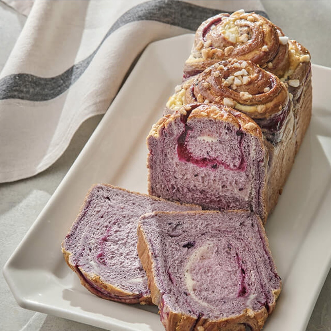 ブルーベリーをたっぷり練り込んだ生地にブルーベリージャムとクリームチーズを巻き、食パン型で焼き上げます